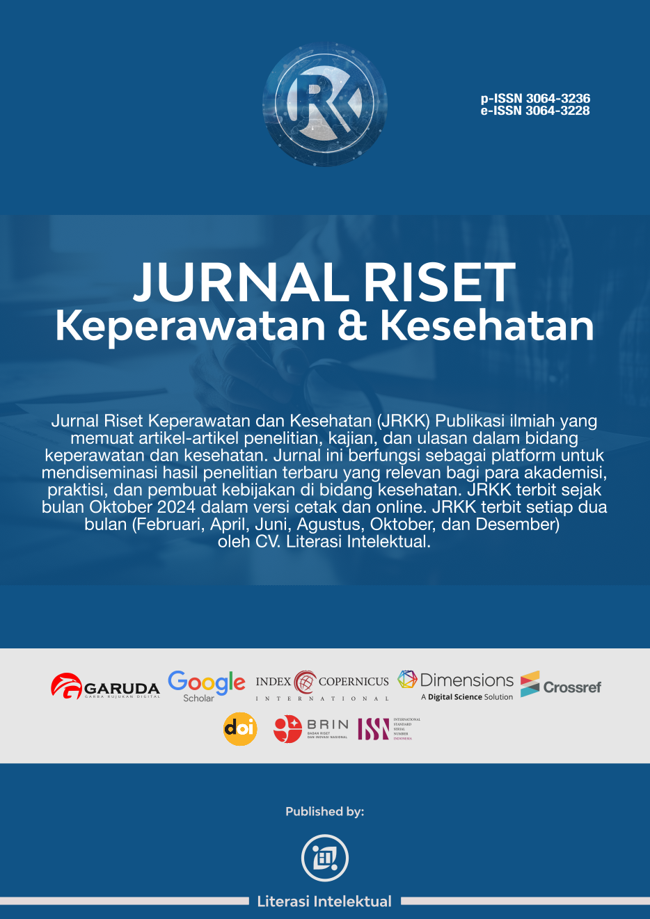 Jurnal Riset Keperawatan dan Kesehatan (JRKK) Publikasi ilmiah yang memuat artikel-artikel penelitian, kajian, dan ulasan dalam bidang keperawatan dan kesehatan. Jurnal ini berfungsi sebagai platform untuk mendiseminasi hasil penelitian terbaru yang relevan bagi para akademisi, praktisi, dan pembuat kebijakan di bidang kesehatan. JRKK terbit sejak bulan Februari 2024 dalam versi cetak dan online. JRKK terbit setiap dua bulan (Februari, April, Juni, Agustus, Oktober, dan Desember) oleh CV. Literasi Intelektual.