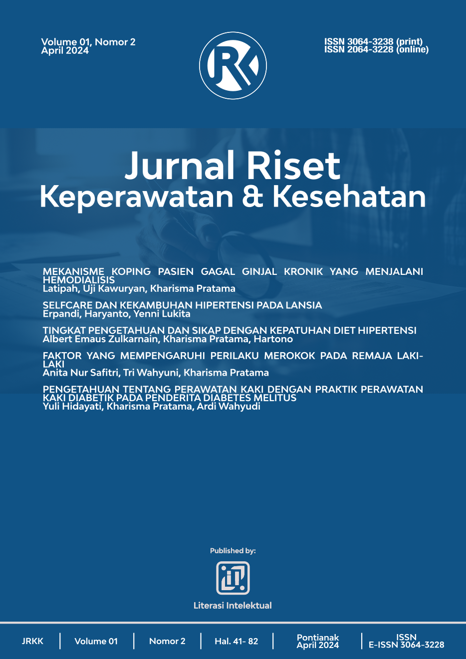 Background: Diabetes mellitus is one of the major non-communicable diseases with high prevalence and severe complications, such as diabetic foot ulcers, which may lead to amputation. Preventive efforts through proper foot care largely depend on patients’ knowledge levels. Objective: This study aimed to determine the relationship between knowledge level and foot care practices among patients with diabetes mellitus in the working area of Sungai Baru Public Health Center, Teluk Keramat District, Sambas Regency. Methods: This research employed a quantitative correlational design with a survey approach involving 44 respondents selected using Proportionate Stratified Random Sampling. Data were collected using the standardized Diabetes Foot Knowledge Questionnaire and the Nottingham Assessment of Functional Footcare. Data analysis was performed using the Chi-Square test with a 95% confidence level. Results: Most respondents were under 55 years old (65.9%), female (54.5%), had elementary education (38.6%), and earned below Rp2,792,599 (93.2%). A total of 61.4% of respondents had good knowledge, and 54.5% had good foot care practices. The Chi-Square test showed a significant relationship between knowledge and diabetic foot care practices (p=0.00). Conclusion: There is a significant correlation between knowledge and foot care practices among diabetes mellitus patients. Continuous health education and nurse-led assistance are essential to improve self-care behaviors and prevent diabetic foot ulcers.