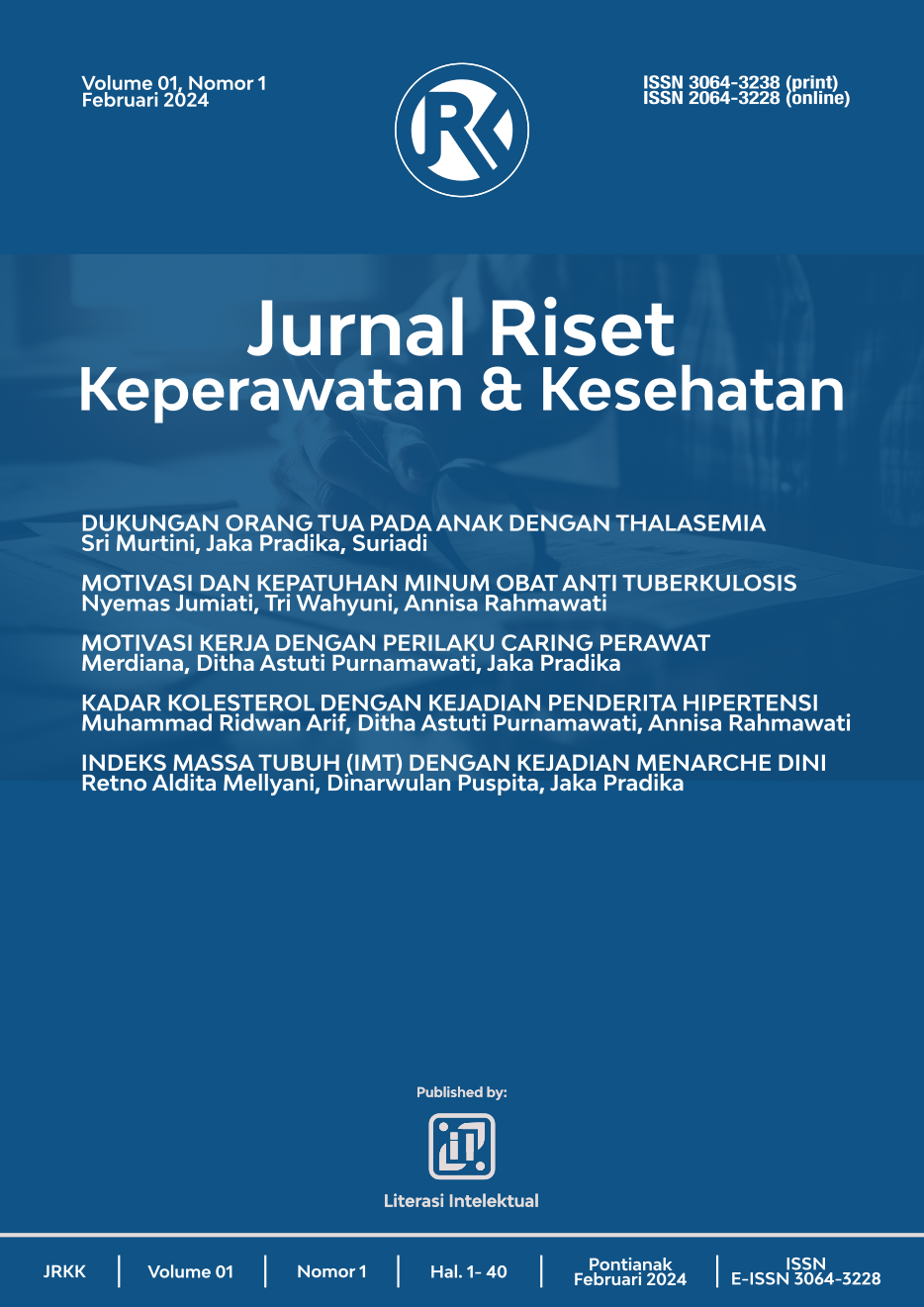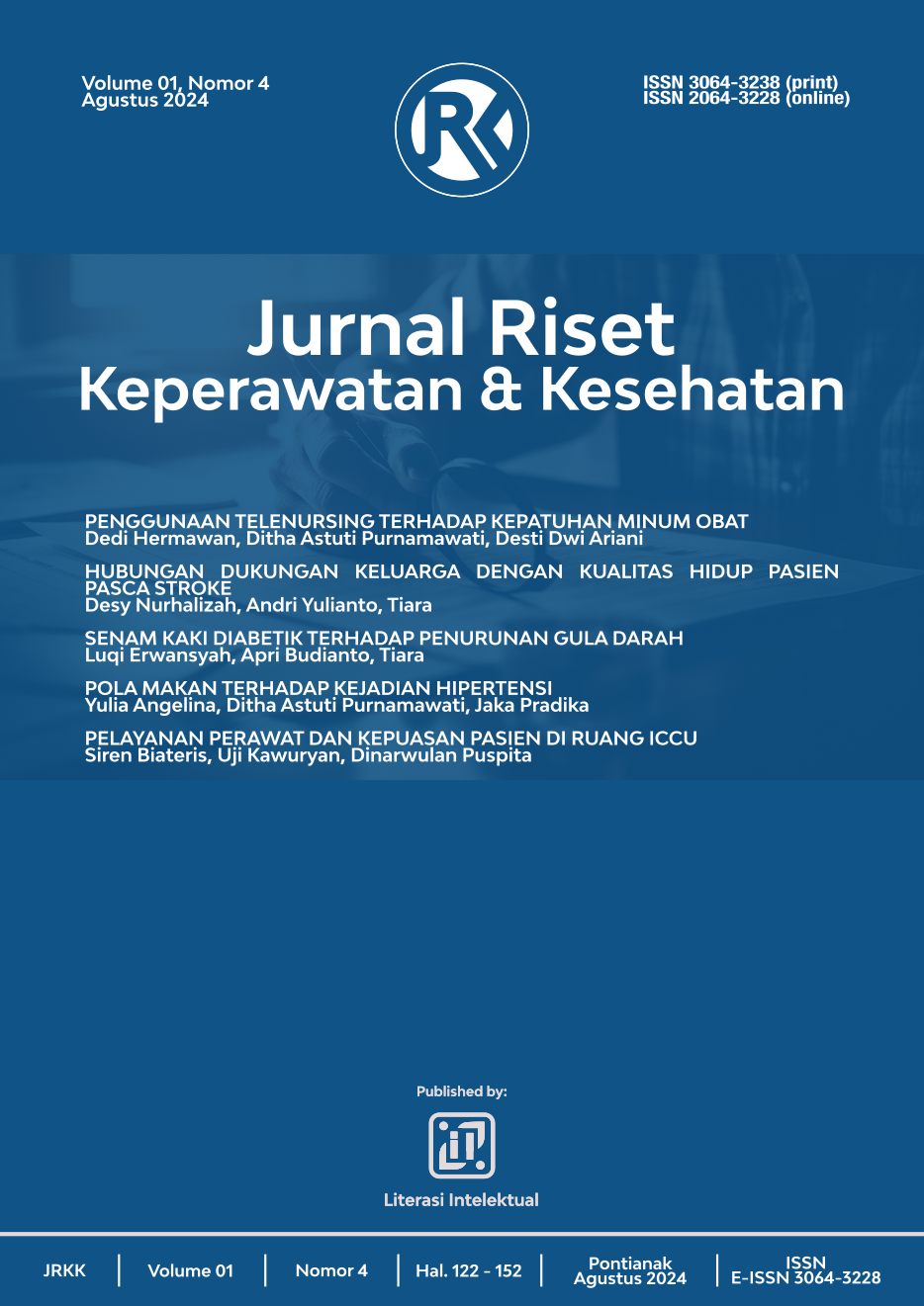 Vol. 1 No. 5 (2024)Jurnal Riset Keperawatan dan Kesehatan (JRKK) Publikasi ilmiah yang memuat artikel-artikel penelitian, kajian, dan ulasan dalam bidang keperawatan dan kesehatan. Jurnal ini berfungsi sebagai platform untuk mendiseminasi hasil penelitian terbaru yang relevan bagi para akademisi, praktisi, dan pembuat kebijakan di bidang kesehatan.